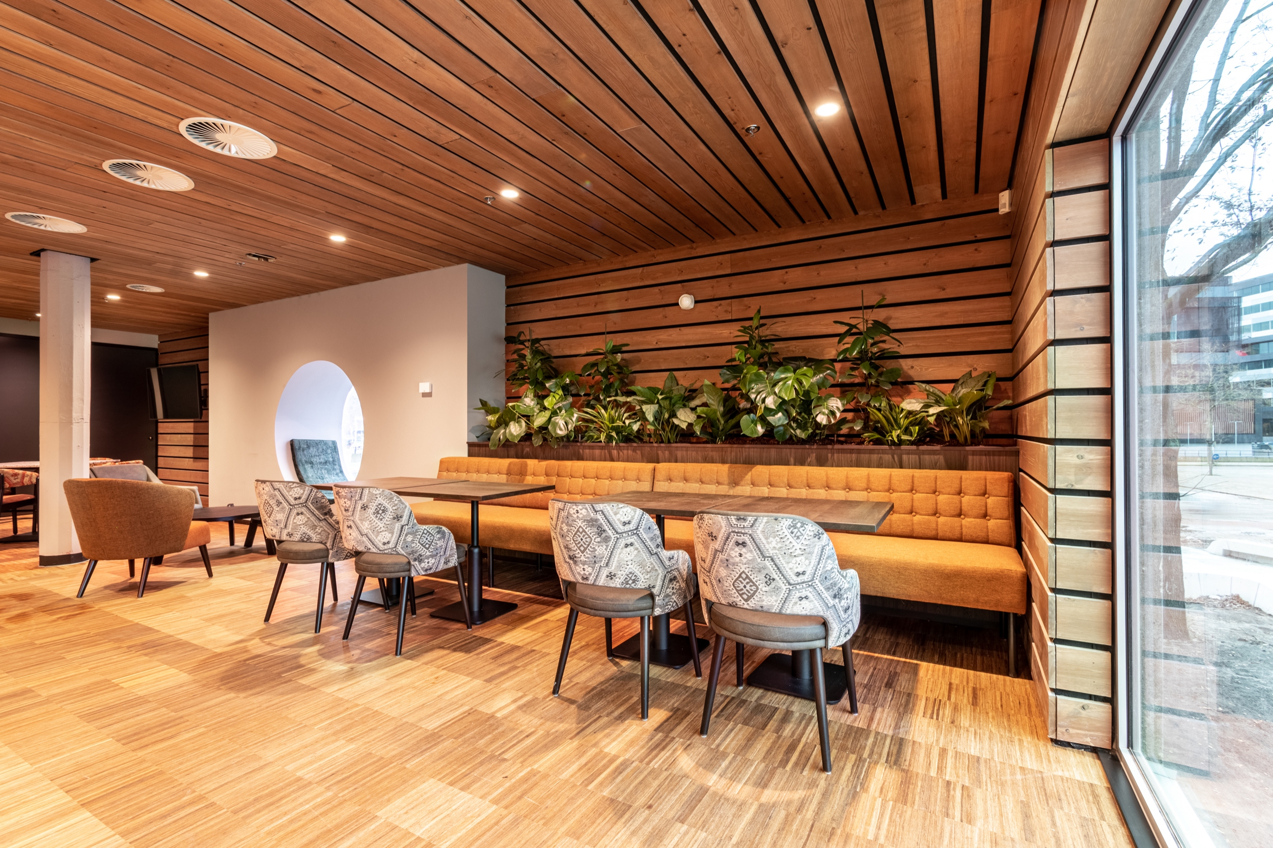 Het grand café is een plek waar je elkaar kunt ontmoeten in een ontspannen café-achtige setting. Het interieur heeft een enorme diversiteit in kleuren, structuren en materialen, maar toch vormt het één geheel.