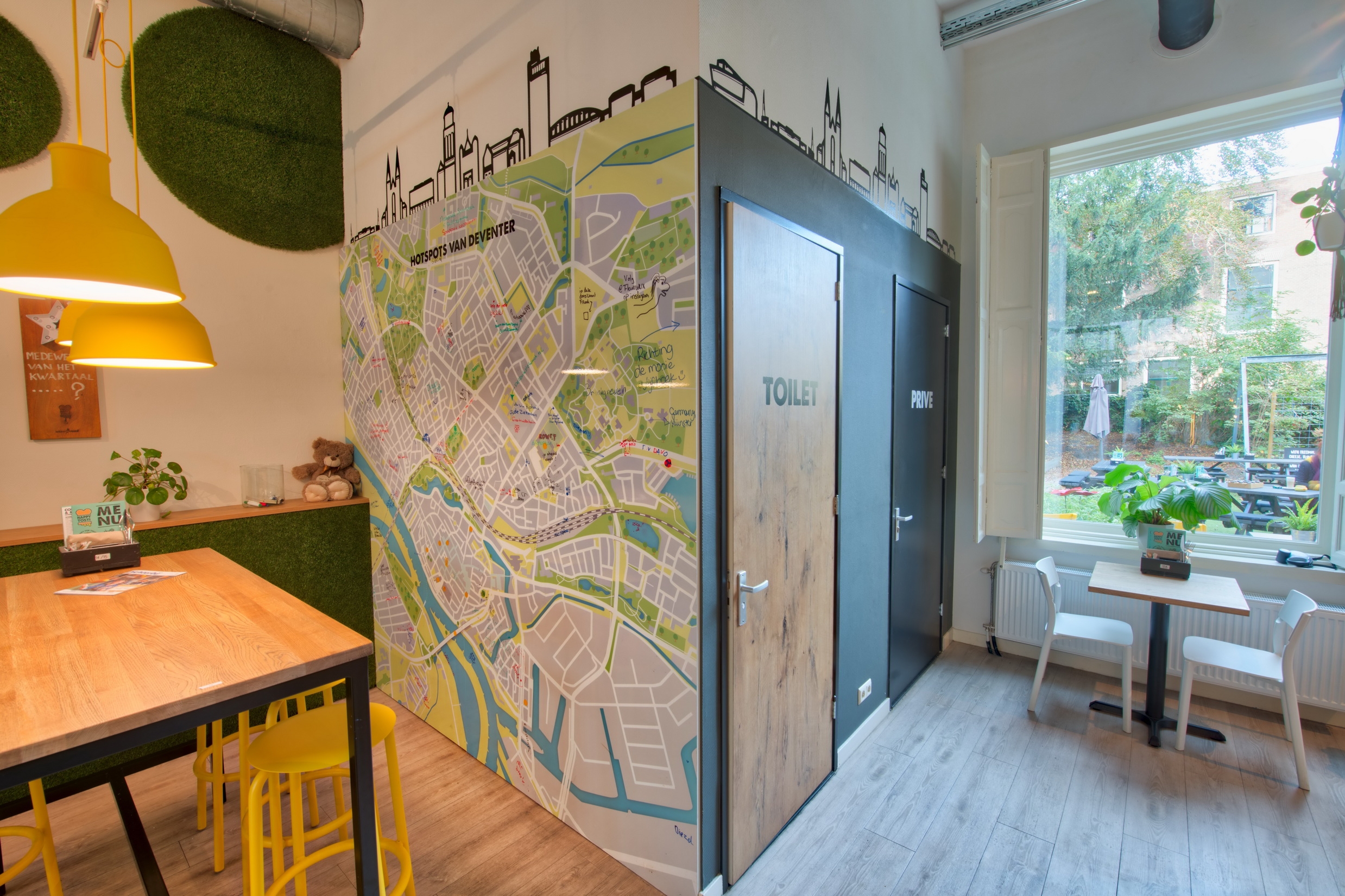 In het concept zijn er verschillende interieuronderdelen en eyecatchers die we in elk restaurant terug laten komen. Deze 'kenmerken' zorgen voor een 'happy' uitstraling en versterken het concept. Zo zie je bijvoorbeeld de schommels, de gele stoelen en vogelhuisjes in elk restaurant terug. Bij elke locatie willen we iets typerends van de stad terug laten komen. In Deventer is bijvoorbeeld een wand voorzien van een plattegrond van de binnenstad.